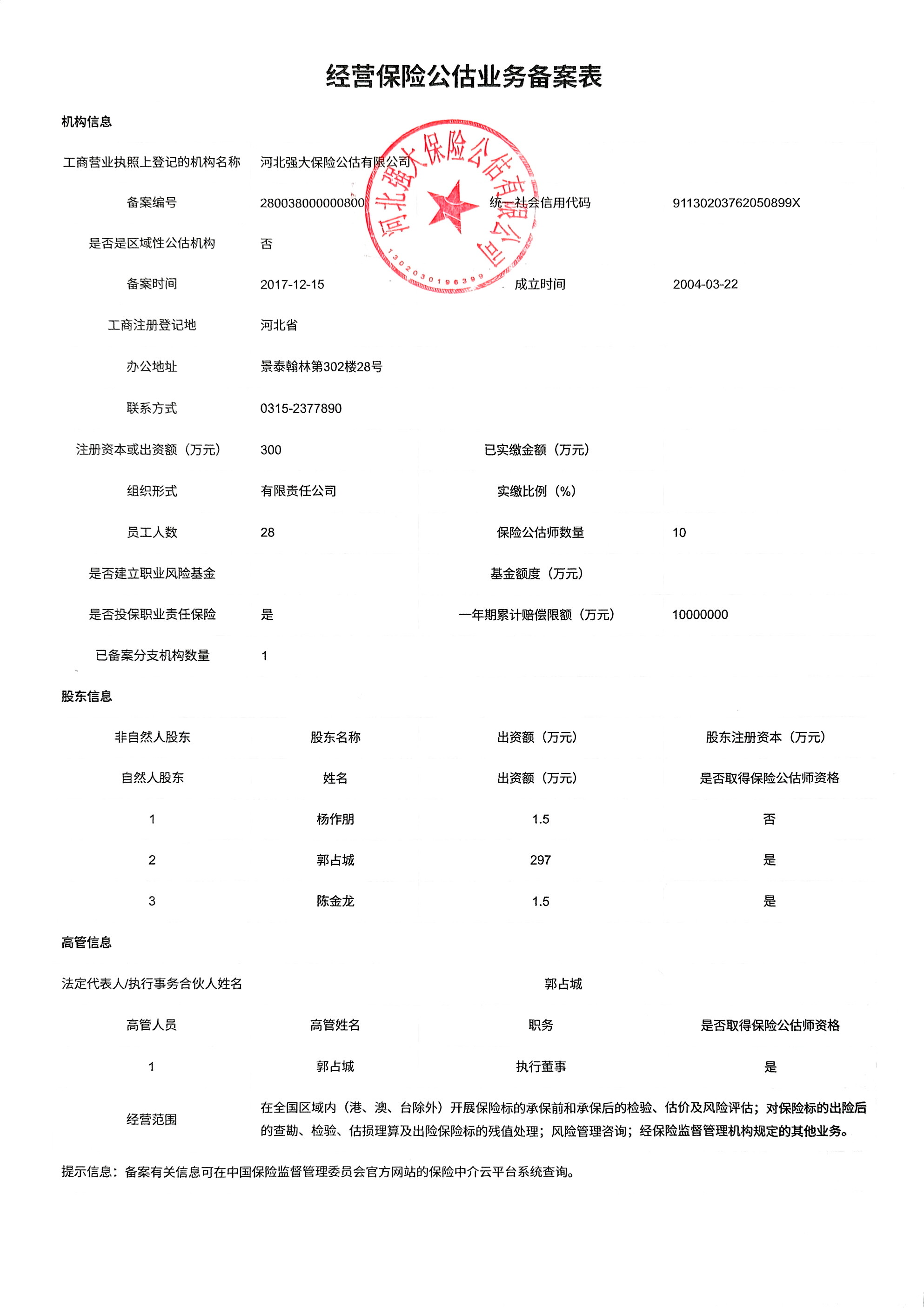 | 公司名称: | 河北强大保险公估有限公司 | ||||