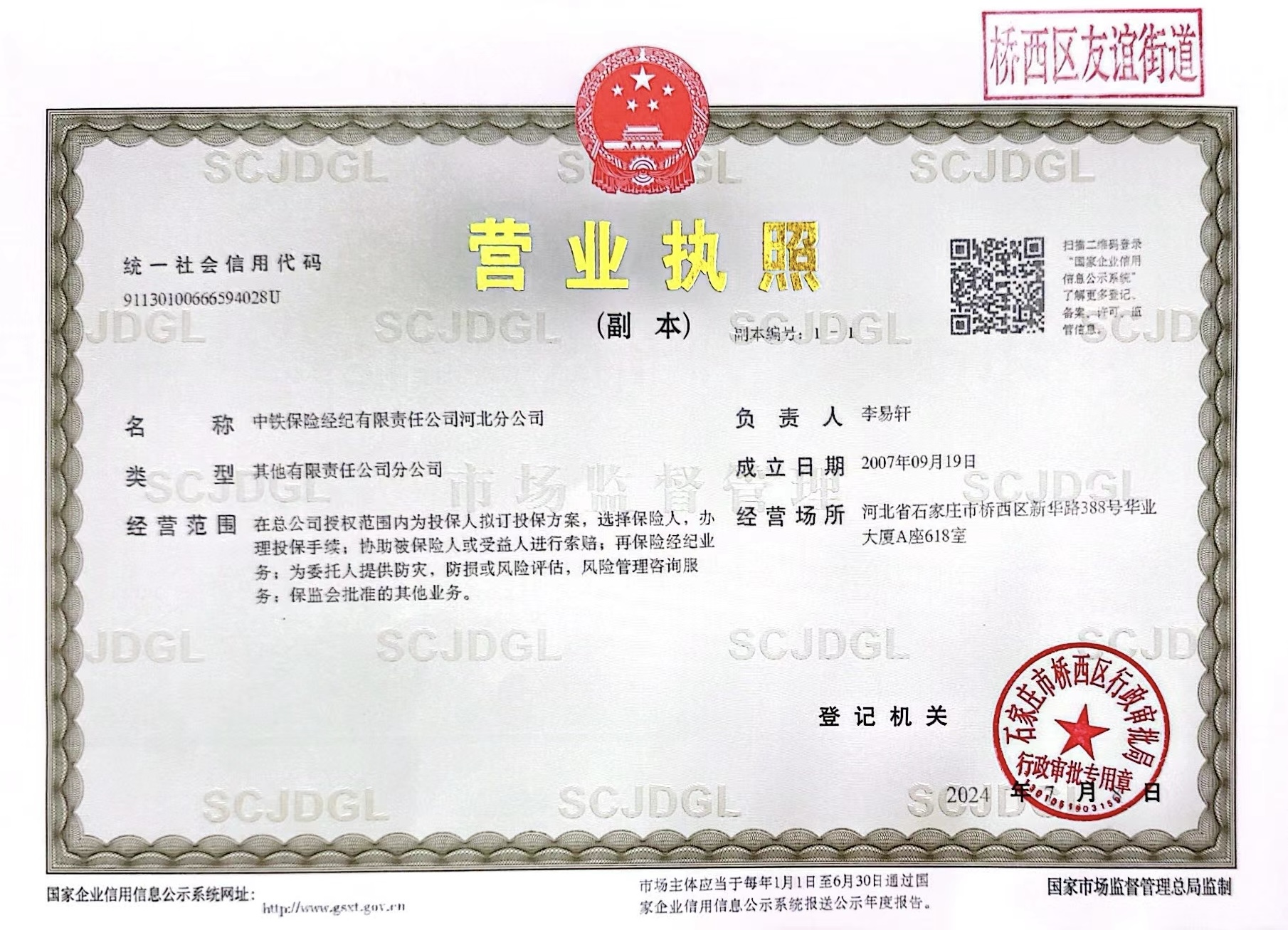 公司名称: 中铁保险经纪有限责任公司河北分公司